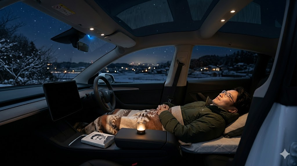 テスラオーナーなら一度は憧れる「キャンプモード」での車中泊。