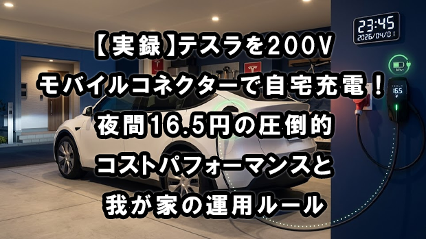 本記事では、私が構築した**「200Vモバイルコネクター」による充電環境と、時間帯別電灯契約をフルに活用した「1kWhあたり16.5円」**の超低コスト運用ルールを公開します。